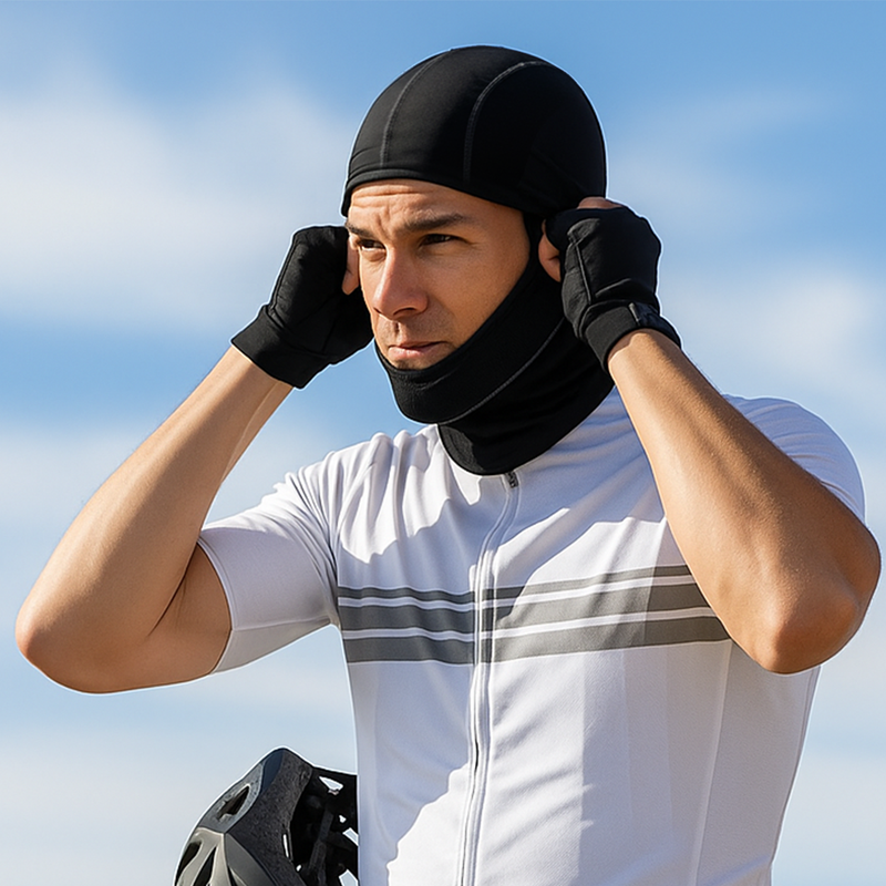 Its 4-way stretch fit ensures it stays snug under helmets or hats without bulk.